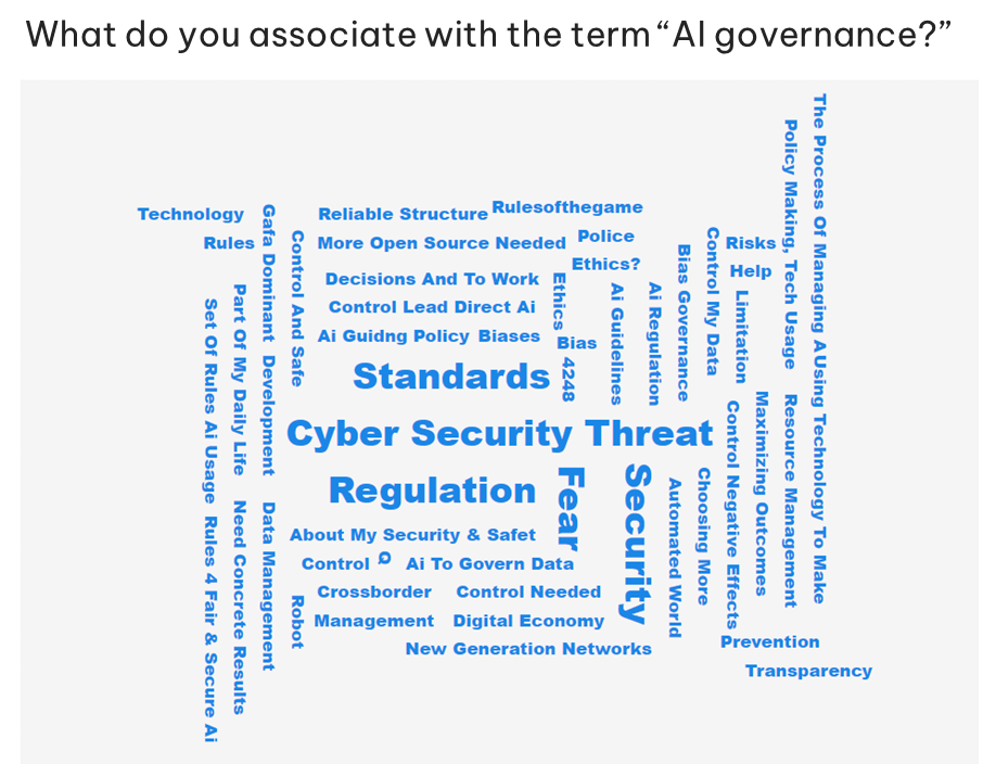 Obwohl die meisten Teilnehmenden eher positive Auswirkungen von KI auf nachhaltige Entwicklung erwarten, verbinden sie auch negative Aspekte wie Cybersicherheitsbedrohungen, Überwachung und das Risiko der Arbeitslosigkeit mit KI. Die meisten sehen nichtsdestotrotz ein großes Potenzial von KI, die globale Produktivität und das Wirtschaftswachstum zu steigern.